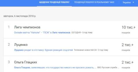 Сьогодні, 6 листопада, українці найбільше шукали у пошуковику Google інформацію, що генпрокурор Юрій Луценко заявив, що сьогодні подасть заяву про свою відставку.