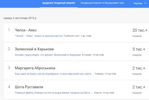 Сьогодні, 6 листопада, українці найбільше шукали у пошуковику Google інформацію про те, що вчора в матчі 4 туру групового етапу Ліги чемпіонів змагалися команди "Челсі" та "Аякс". Матч завершився з рахунком 4:4.