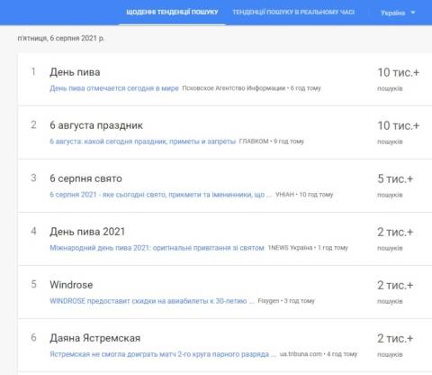 Сьогодні, 6 серпня, українці найбільше шукали у пошуковику Google інформацію про те, що щорічно відзначається в першу п’ятницю серпня у світі відзначають Міжнародний день пива.
