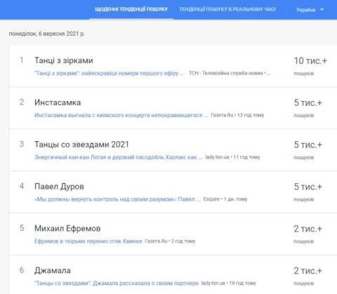 Сьогодні, 6 вересня, українці найбільше шукали у пошуковику Google інформацію про те, що у неділю, 5 вересня, відбувся перший прямий ефір шоу "Танці з зірками".