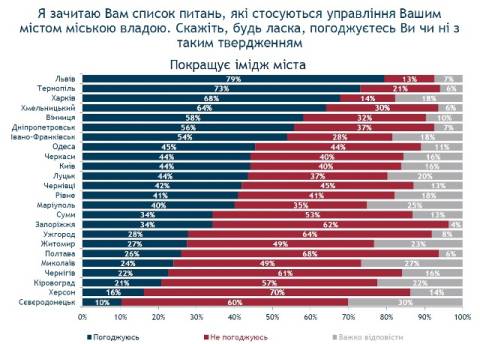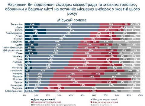 Відтак, за результатами дослідження, проведеного Соціологічною групою "Рейтинг" 20 січня 8 лютого – цього року у 24 містах країни, 65% задоволені мером міста, якого вибрали на місцевих виборах у 2015 році, 21% – проти, ще 12% мешканців міста не визначилися із своєю позицією.