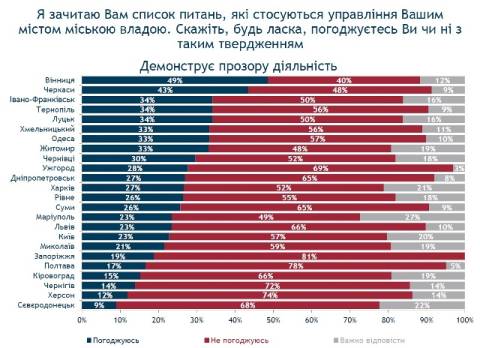 66% львів'ян вважають непрозорою діяльність міськради, 23% – навпаки. 68% мешканців, проти 19%, переконані, що міська рада не долучає громадськість до процесу прийняття рішень до рішень та не забезпечує якісний документообіг (47%).