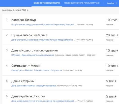 Сьогодні, 7 грудня, українці найбільше шукали у пошуковику Google інформацію про те, що Google присвятив дудл 120-річчю від дня народження української художниці Катерини Білокур, віртуоза-самоучки, яка стала відомою на весь світ завдяки своїм деталізованим і яскравим картинам, особливо з зображеннями квітів.