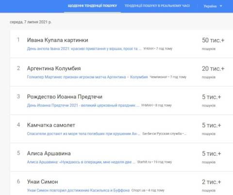Крім цього, українці цікавилися інформацією, що у матчі 1/2 фіналу Кубка Америки-2021 збірна Аргентини перемогла Колумбію за пенальті (1:1, пенальті – 3:2). У фіналі Аргентина буде грати проти Бразилії, а Колумбія зіграє за 3-тє місце проти Перу. Матчі пройдуть 9 та 10 липня.