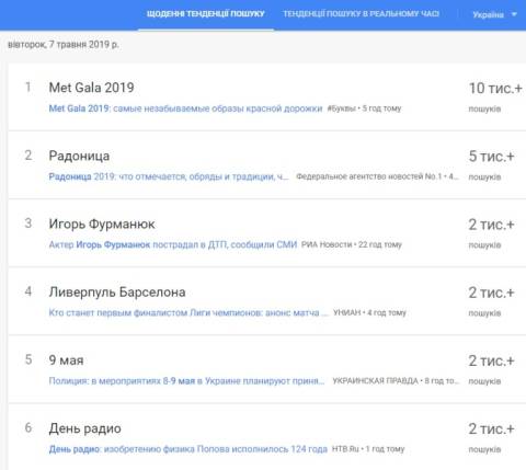 Сьогодні, 7 травня, українці найбільше шукали у пошуковику Google інформацію, що цього вчора відбувся Met Gala 2019 – Бал Інституту костюма, що проходить щорічно у нью-йоркському Музеї мистецтва Метрополітен.