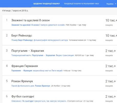 Сьогодні, 7 вересня, українці найбільше шукали у пошуковику Google інформацію, що вчора футбольний товариський матч між Португалією та Хорватією завершився нічиєю – 1:1.