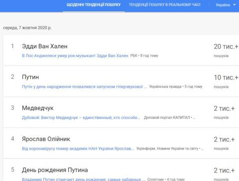 Сьогодні, 7 жовтня, українці найбільше шукали у пошуковику Google інформацію про те, що ввечері 6 жовтня в США помер відомий американський гітарист Едді Ван Хален.
