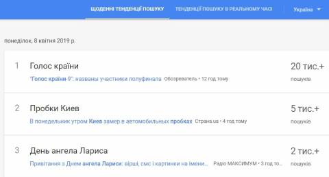 Сьогодні, 8 квітня, українці найбільше шукали у пошуковику Google інформацію, що у неділю, 7 квітня, відбувся перший прямий ефір Голосу країни-9. На сцену вийшли найсильніші учасники сезону з команд зіркових тренерів Тіни Кароль, Потапа, MONATIKа і Dan Balan..