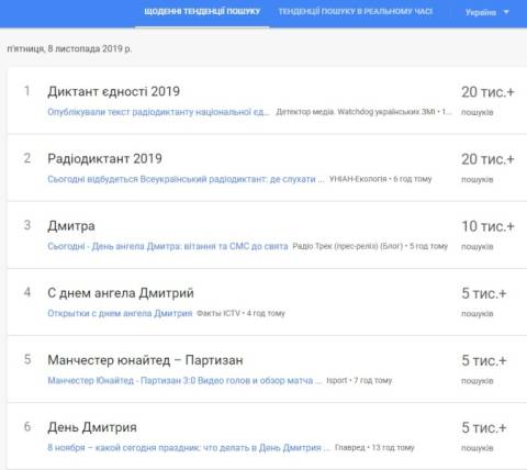 Сьогодні, 8 листопада, українці найбільше шукали у пошуковику Google інформацію про те, що в Україні відбувся всеукраїнський радіодиктант національної єдності. Участь могли взяти всі охочі, а зачитав диктант відомий автор підручників з української мови Олександр Авраменко.
