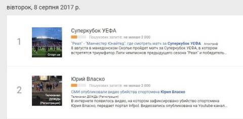 Сьогодні, 8 серпня, українці найбільше шукали у пошуковику Google інформацію, що сьогодні іспанський футбольний клуб "Реал" та англійський "Манчестер Юнайтед" зустрічаються у матчі за Суперкубок УЄФА.