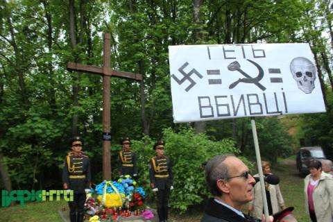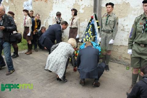 Садовий, Сех та Колодій вшановують загиблих у Другій Світовій війні і тому покладають квіти до пам’ятного знаку на території колишнього концентраційного табору Шталаг-328.