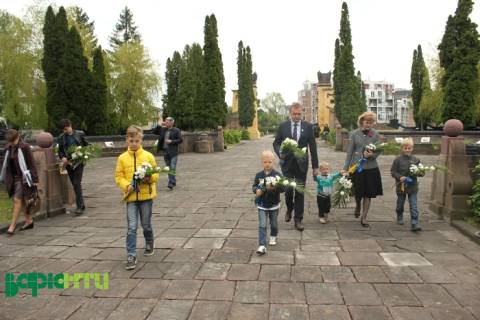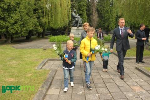 Попереду – багатодітна сім'я Садового іде з квітами вшановувати загиблих у Другій Світовій.