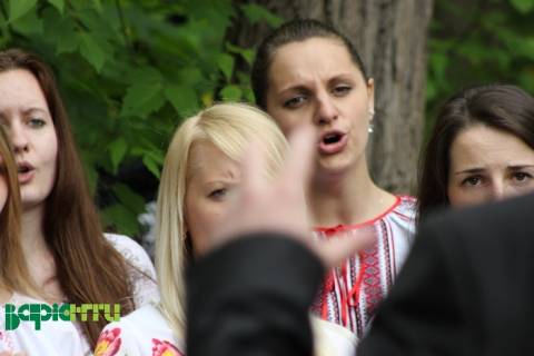 Море громадськості молиться. Хор співає. Хмари пливуть. Дерева хитаються.