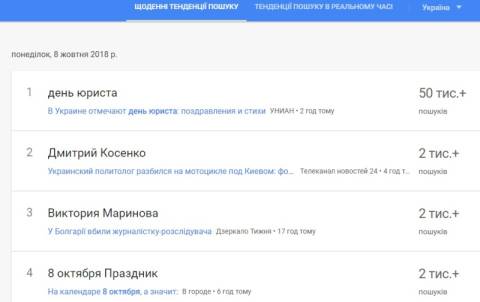 Сьогодні, 8 жовтня, українці найбільше шукали у пошуковику Google інформацію, що вчора у Болгарії скоєно жорстоке вбивство адміністративної директорки і ведучої регіонального телеканалу TVN Вікторії Марінової. Тіло 30-річної журналістки виявили в місті Руса.