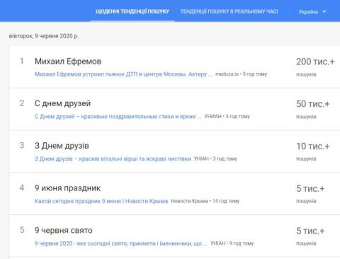 Сьогодні, 9 червня, українці найбільше шукали у пошуковику Google інформацію про те, що актор Михайло Єфремов потрапив в ДТП за участю декількох автомобілів в районі Смоленської площі в Москві.