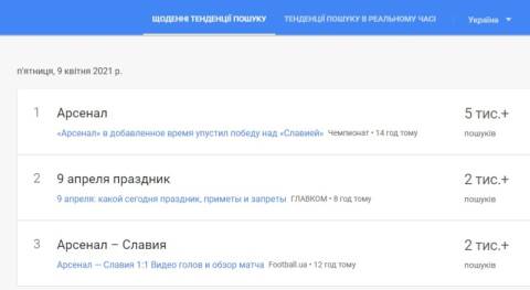 Сьогодні, 9 квітня, українці найбільше шукали у пошуковику Google інформацію про те, що цього дня у першому матчі 1/4 фіналу Ліги Європи зіграли Арсенал та Славія (Прага). Матч завершився з рахунком 1:1.