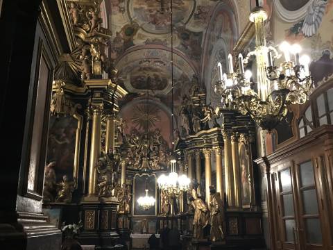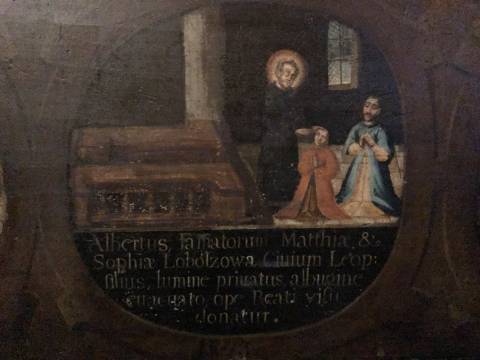 Його внутрішнє оздоблення вражає масивною позолотою, розкішними фресками, величезними люстрами з міньйонами, масштабними скульптурами святих та органом, який зберігся ззовні в чудовому стані. Тому увага лише небагатьох з тих відвідувачів, кому вдалося протиснутися крізь натовп вірян та туристів до вівтарної частини храму, зупиняється на розташованих на стінах побляклих дерев'яних панно, які вкриті розписними медальйонами з підписами латинкою. Всього їх 90. Кожен сюжет – це розповідь про чудо, яке сотворив Бог через молитву до святого Яна з Дуклі.