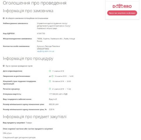 Управління адміністрування послуг департаменту адміністративних послуг Львівської міської ради оголосило тендер у системі ProZorro на спеціальний одяг для адміністраторів, які переможець тендеру має поставити до 30 листопада 2019 року.