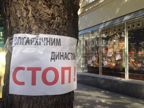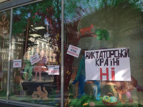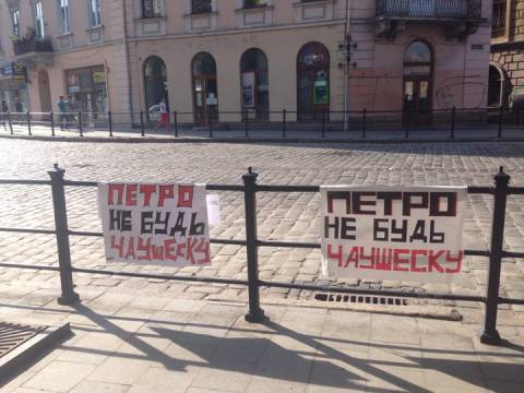 Зокрема, активісти розклеїли на вітринах магазину та на деревах плакати із написами "Олігархічним династіям Стоп!", "Диктаторській країні Ні!", "Петро не забудь Чаушеску".
