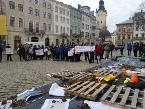 Нагадаємо, пікетувальники облаштували для посадовців доріжку з болота біля входу до Львівської міськради, щоб "чиновники пройшлася по цій важкій болоті дорозі і усвідомили, як живуть прості люди".