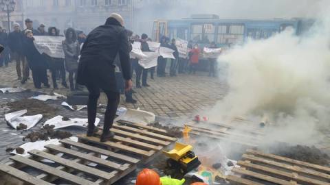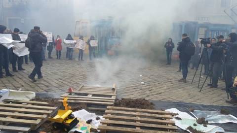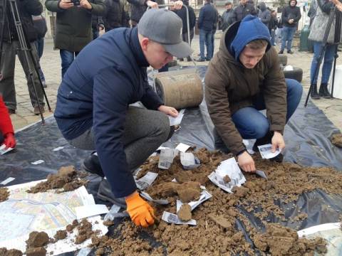 За словами активістів, вони "закатують гроші з фотографією Андрія Садового у болото, ніби як бюджет міста". Також хтось із присутніх кинув димову шашку.