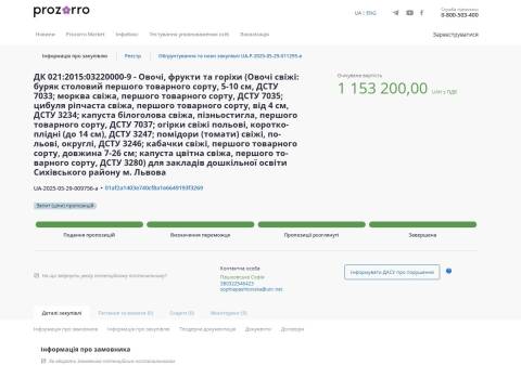 - овочі свіжі: буряк столовий першого товарного сорту, морква свіжа першого товарного сорту; цибуля ріпчаста свіжа першого товарного сорту; капуста білоголова свіжа першого товарного сорту; огірки свіжі; помідори свіжі; кабачки свіжі першого товарного сорту; капуста цвітна свіжа першого товарного сорту, – для закладів дошкільної освіти Сихівського району Львова.