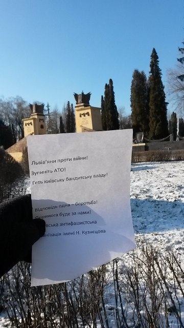 Третього січня в спільноті "Львівська народна республіка" Вконтакті оприлюднено фотографії з пропагандистськими закликами членів незареєстрованої "Львівської антифашистської організації імені Миколи Кузнецова".