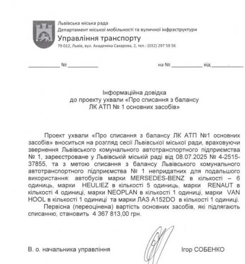 "Ці автобуси зняті з експлуатації ще у 2017 році. За цей час вони повністю зносилися: кузови зруйновані корозією, електроніка та силові агрегати вийшли з ладу. Нових запчастин для ремонту вже не виробляють. Це фізично й морально застаріла техніка, яку відновлювати недоцільно" – пояснили в ЛК АТП-1.