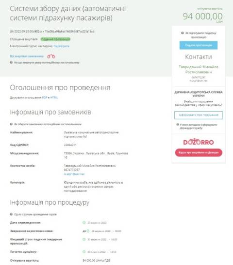 Львівське комунальне автотранспортне підприємство №1 оголосило тендер у системі ProZorro на системи збору даних (автоматичні системи підрахунку пасажирів), які переможець тендеру має поставити до 21 листопада 2022 року.
