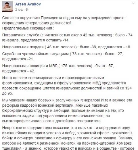 Загалом у всіх військових структурах та правоохоронних органах Аваков ініціює скоротити штат генеральських званнів та посад зі 194 до 95.