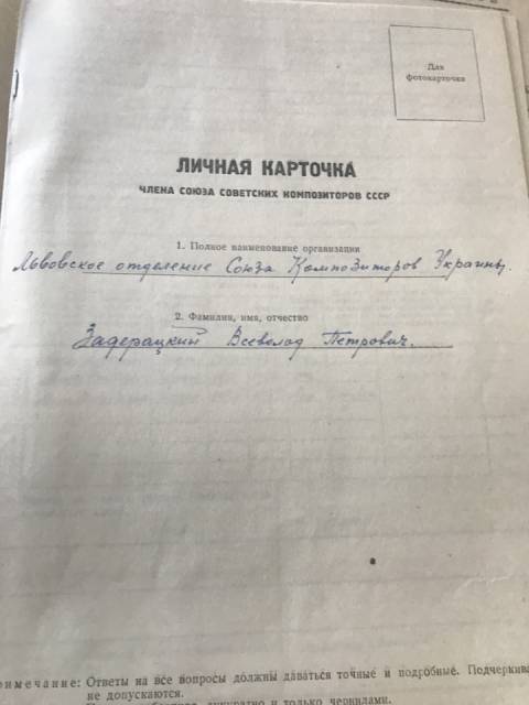 Невисокий книжковий стелаж, який ще пам'ятає радянські часи. Декілька рядів старих тек та зошитів, які поклали доволі хаотично. Це архів Львівського відділення Національної Спілки композиторів України. Варіанти прийшли сюди, щоб відшукати бодай незначні документальні сліди життя та діяльності композитора Всеволода Петровича Задерацького у Львові. Перед тим ці пошуки зазнали невдачі у консерваторії. І в Спілці Варіанти також запевнили, що всі пошуки марні, оскільки протоколи засідань 50-х років минулого століття, ймовірно, не збереглися. Хіба що особисті справи членів Спілки.