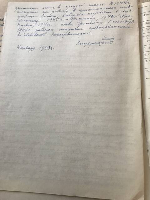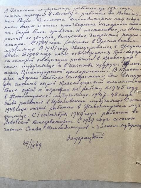 Витягаємо першу теку. Не те, не те, і знову не те. Перед нами другий стос документів і вже стає цікавіше. Поруч з переліками майна Музфонду з'являються теки з особистими справами членів спілки: Людкевич, Ярославенко, Кос-Анатольський тощо. Але часу на їхнє дослідження немає. І вже коли переглянули майже всі документи, то несподівано знаходимо тоненький, вицвілій від часу швидкозшивач з прізвищем Задерацький. У такий успіх відразу якось важко повірити, але в теці знаходимо усе те, що так довго шукали.