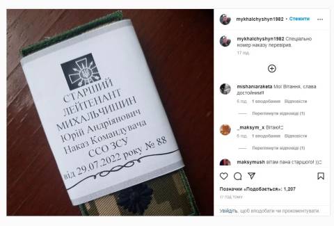 Командувач ССО Збройних сил України у своєму наказі від 29 липні 2022 року надав офіцеру групи комплектування окремого загону спеціального призначення "Азов", в/ч 3057 Національної гвардії України Юрію Михальчишину звання старшого лейтенанта.