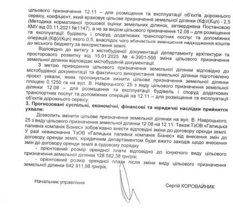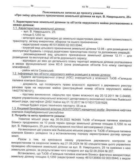 Згідно з документом, йдеться про земельну ділянку площею 0,1250 га на вул. В. Навроцького, 25 у Сихівському районі Львова, що перебуває у комунальній власності Львова. На цій ділянці знаходиться АЗС Socar площею 55 м², що з 2011 року є у приватній власності ТзОВ "Галицька паливна компанія "Бізнес". Фірма орендує у міськради цю земельну ділянку за 128 582,38 грн в рік.