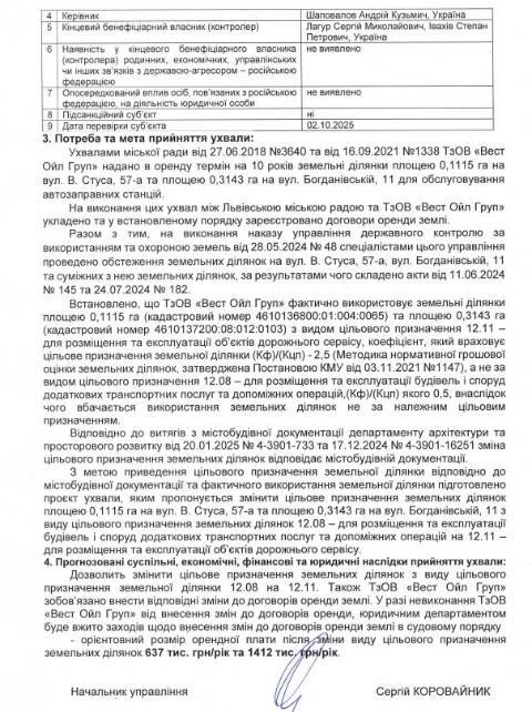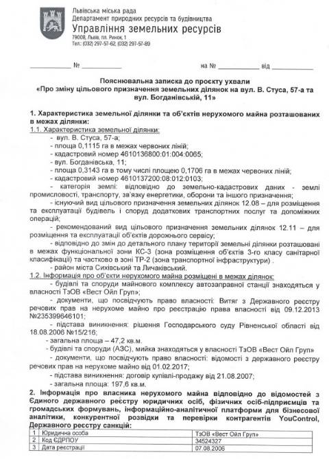 Згідно з документом, йдеться про земельні ділянки площею 0,1115 га на вул. В. Стуса, 57-А та площею 0,3143 га на вул. Богданівській, 11 у Львові, що перебувають у комунальній власності Львова. На цих ділянках знаходяться АЗС WOG площею 47,2 м² й 197,6 м², що з 2013 та з 2007 року є у приватній власності ТзОВ "Вест Ойл Груп".