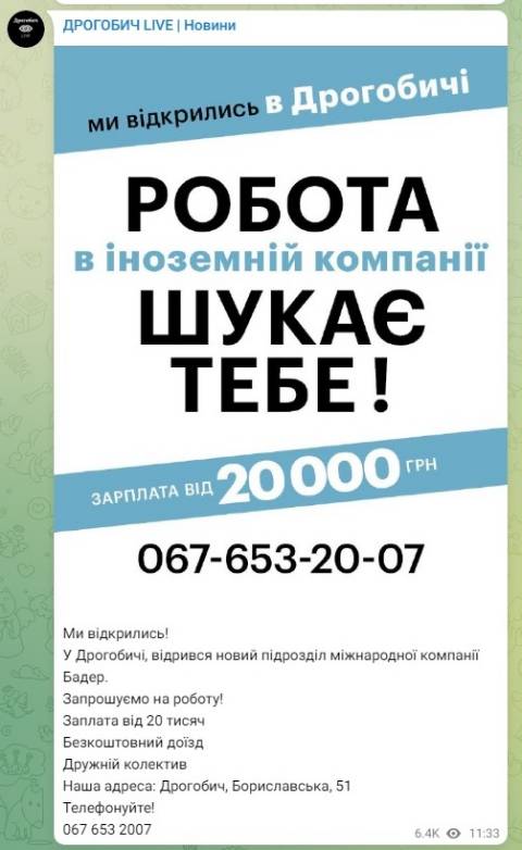 Запрошуємо на роботу. Заплата від 20 тисяч" – йдеться у повідомленні.