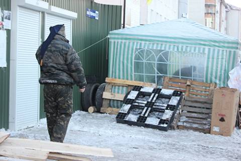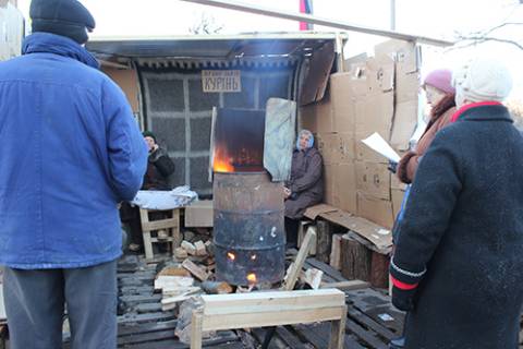 Тут солідні чоловіки приїхавши на джипах у напастованих лакостах, вбираються у валянки та поряд із радикальними юнаками Правого сектору згортають сніг або перекочують шини.