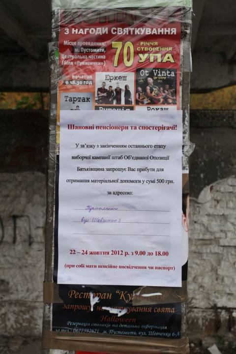 Листівки такого змісту «прикрасили» стовпи, автобусні зупинки, паркани та стіни будівель у Львові, Пустомитах, Городоцькому, Сколівському районах Львівської області та інших. Зазначимо, що своїми діями представники так званої «об’єднаної опозиції» грубо порушили виборче законодавство, зокрема, частину другу статті 6 Закону України «Про вибори народних депутатів України»: «Застосування насильства, погроз, обману, підкупу чи будь-яких інших дій, що перешкоджають вільному формуванню та вільному виявленню волі виборця, забороняється».