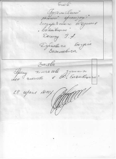 У підтвердження правдивості своєї інформації та намірів ВО «Батьківщина» надала документ – заяву Богдана Дубневича про бажання тимчасово призупинити своє членство у ВО «Батьківщина», датовану 2010 роком.