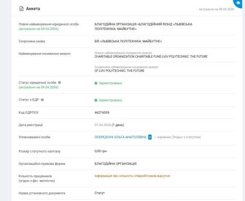 У вівторок, 7 квітня, у Львові, за даними аналітичної системи YouControl, офіційно зареєстрували благодійний фонд "Львівська політехніка: Майбутнє", покликаний стати інструментом системної підтримки та розвитку університету.