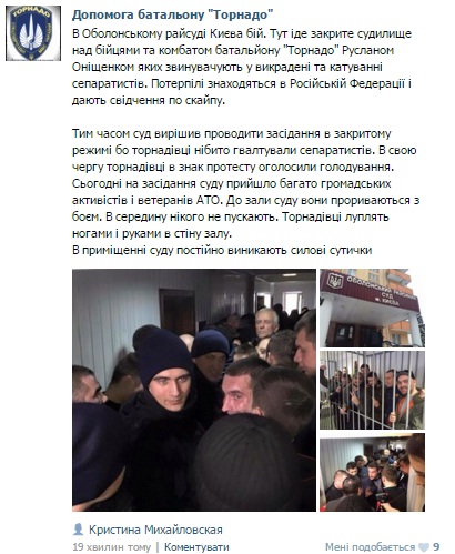 Боєць батальйону Олександр "Фарт" Кураков повідомив, що серед семи підсудних є троє бійців зі Львова й Львівщини. Сьогодні об 11:30 в Облонському районному суді Києва проходить закрите засідання по справі торнадівців. В соцмережах повідомляють, що активісти намагають потрапити на судове засідання.