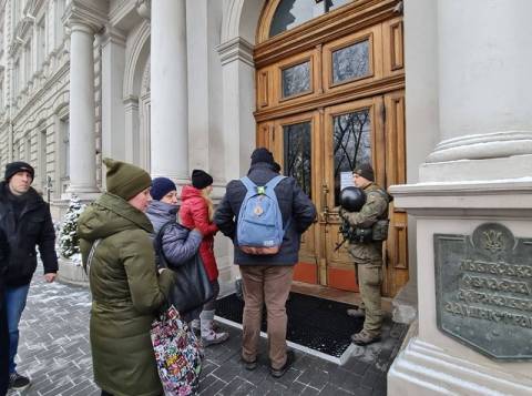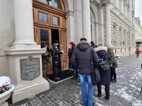 У Львові біля Львівської ОДА на вул. Винниченка, 18 встановили блокпости. Вхід всередину будівлі облдержадміністрації можливий лише за перепустками, їх перевіряють на вході.