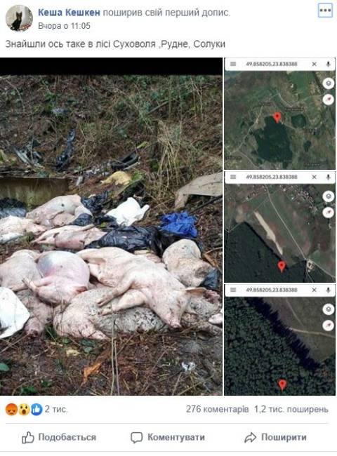 Зазначимо, вчора у спільноті "Варта-1" у Facebook з’явилась інформація про те, що нібито у лісі поблизу сіл Суховоля, Рудне та Солуки знайшли тушки дохлих свиней
