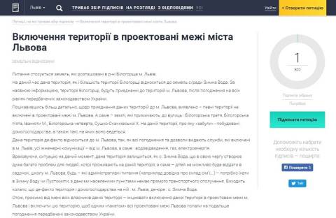 "Поцікавившись більш детально, щодо приєднання даних територій до м. Львова, виявлено – певні території не включені в проектовані межі м. Львова. А саме – землі, які примикають, до вулиць: Білогорська третя, Білогорська п'ята, Іванюти М., Білогорська четверта, Сушко-Скачківської Х. На даній території, про яку "забули" – побудовані домогосподарства, а також такі, на яких воно ведеться" – йдеться у тексті петиції.