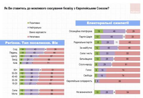 Найбільше виступають проти можливого скасування безвізу молодь, мешканці Києва та Заходу, прихильники "Європейської Солідарності", "Свободи", "Голосу" і партії "Слуга народу".