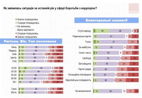 Також, оцінюючи зміни у сфері боротьби з корупцією протягом останнього року, 47% опитаних не побачили зрушень, 34% – вважають, що ситуація погіршилася, 14% – побачили позитивні зміни.