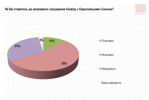 Згідно з результатами опитування, 55% українців негативно ставляться до можливого скасування безвізу з Європейським Союзом, спричинене рішенням Конституційного Суду про неконституційність антикорупційного законодавства, 11% – позитивно і 31% – нейтрально.