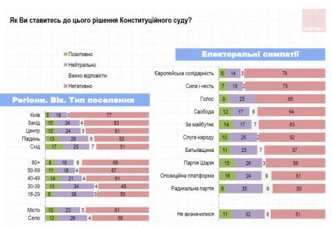 Проти рішення Конституційного Суду виступають 59% опитаних натомість 11% опитаних його підтримують, ще 25% ставляться нейтрально. Найбільше протестують проти цього рішення люди старшого віку, кияни, мешканці Західної і Центральної України, прихильники "Європейської солідарності", "Голосу" і партії "Сила і честь".
