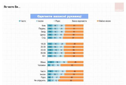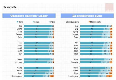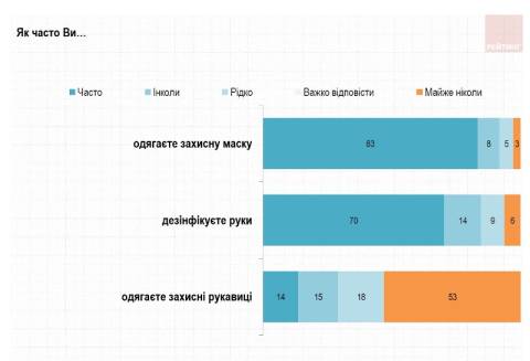Крім цього, 70% українців часто дезінфікують руки, 23% – інколи або рідко, 6% – майже ніколи. Лише 14% часто використовують захисні рукавиці, 33% – інколи або рідко, 53% – майже ніколи.