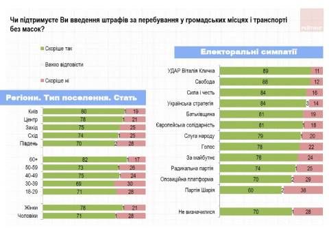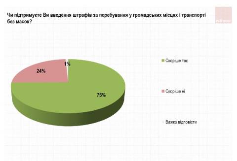 Згідно з результатами опитування, 75% українців підтримують введення штрафів за перебування у громадських місцях і транспорті без масок, натомість 24% опитаних виступали проти цього.